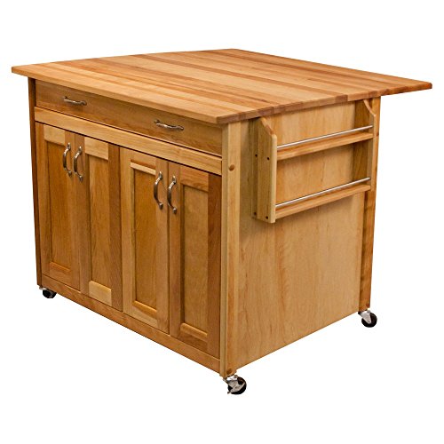Description: Catskill Craftsmen has become the nation's leading manufacturer of ready-to-assemble domestic hardwood kitchen islands, carts and work-centers. Catskill Craftsmen manufactured items are made from naturally self-sustaining, non-endangered North American hardwoods, primarily Northern Yellow Birch. Lumber is purchased from area sawmills, then dried, manufactured and packaged on site. All sawdust, shavings and waste materials generated during the manufacturing process is converted into wood pellet fuel and used to heat homes. This cart comes with a drop leaf that doubles the work surface. It comes with a large drawer, spice rack and towel bar. The wheels have locking casters and the interior shelves are adjustable. The hardware is nickel plated and the wood has an oiled finished. Solid hardwood doors, drawer parts, legs, braces, drop leaf and top. Warp-resistant hardwood veneer side and back panels and shelves. Crafted from sustainably harvested domestic hardware, is ready to assemble and is made in the USA.