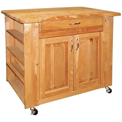 Description: Catskill Craftsmen has become the nation's leading manufacturer of ready-to-assemble domestic hardwood kitchen islands, carts, and work-centers. Catskill Craftsmen manufactured items are made from naturally self-sustaining, non-endangered North American hardwoods, primarily Northern Yellow Birch. Lumber is purchased from area sawmills, then dried, manufactured, and packaged on site. All sawdust, shavings and waste materials generated during the manufacturing process is converted into wood pellet fuel, and used to heat homes. The Deep Storage Island features a solid butcher block top which is safe for food preparation. A convenient drawer and cabinet with an interior adjustable shelf offer an enormous amount of storage, not to mention the side shelves featured on both ends of the island. Locking wheels allow for mobility within the kitchen, or lock in place to provide a stationary work area. The top, legs, braces, drawer, doors and exterior shelves area all solid hardwood, while the side and back panels are warp-resistant veneer. Raised panel doors and drawer add a level of elegance to this functional island. This version also featurs a larger top with a contoured front edge.