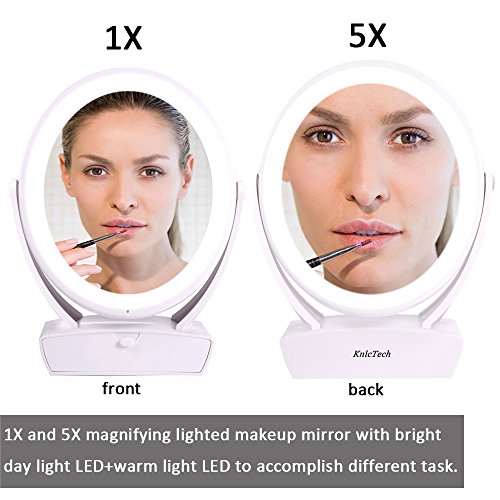 Vanity Mirrors - KnicTech Dual-Color LED Lighted Makeup Mirror with Drawer, Double-Sided 1x/5x Magnifying Tabletop Vanity Mirror, 360 Swivel, USB Rechargeable, Removable Illuminated Cosmetic Mirror(White)